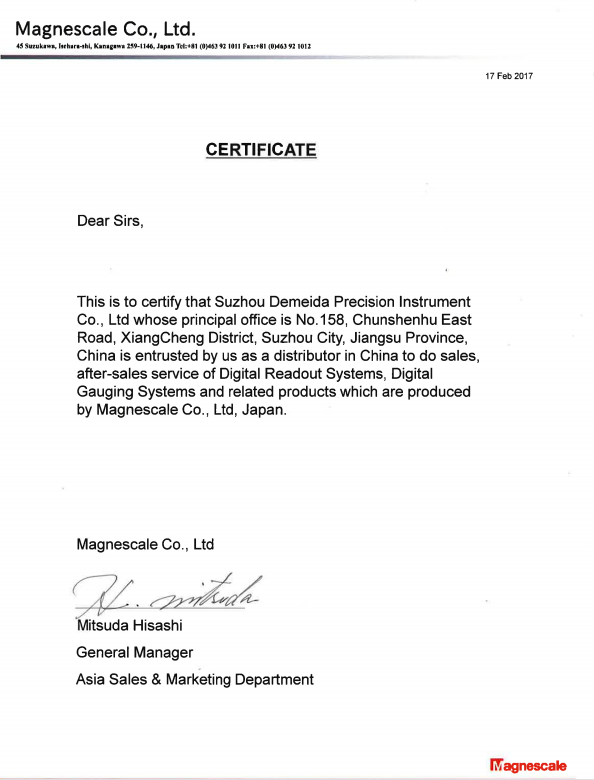 我為日本Magnescale Co.,Ltd原SONY系統株式會社授權代理商,負責Magnescale公司全系列產品銷售、技術支持、售后服務,感謝Magnescale公司一直以來對我司的大力支持與關照,我司將全力以赴的服務好使用Magnescale產品的用戶,同時也非常感謝不同行業的用戶對Magnescale的選擇與肯定。熱烈歡迎各位用戶的監督,Magnescale Co., Ltd授權代理證如下: