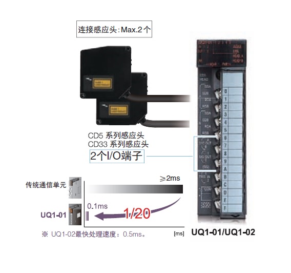 三大機能,實現(xiàn)高速處理 測量數(shù)據(jù)由UQ1內(nèi)部處理 PLC的CPU無負載 UQ1可自動從傳感器獲取測量數(shù)據(jù),并對數(shù)據(jù)進行演算·判定·輸出等處理,處理速度可達100μs。 上述處理程序均由UQ1獨自完成,無需PLC的CPU處理,因此不會增加CPU負荷。也不需要等待處理的時間。 內(nèi)置I/O端子 處理速度:100μs UQ1內(nèi)置2個I/O端子(各2個),因此無需依賴PLC的CPU的掃描時間。