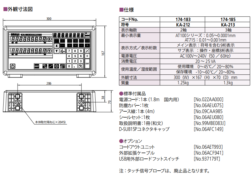產品介紹日本三豐mitutoyo KA-200系列計數器 KA-212,KA-213,KA-13、KA-12數顯表 技術參數:常規 輸入端口數: 2, 3 分辨率: 0.001mm, 0.005mm, .0001", .0005" (可轉換) 顯示: 7位LED和一個負號[-]標志 電源: 100V-240V AC, 50/60Hz 重量: 1.1kg (2軸), 1.2kg (3軸) 特點 ?帶有10坐標功能和現有KL計數器功能的高性價比2/3軸計數器。 ?修改參數后KA計數器可作為“標準計數器”或“車床計數器”使用。 選件 ?可與現有的AT100系列光柵尺和新型 AT715電磁感應光柵尺連接。 938140:電子測頭(柄部直徑:20mm) 935094:電子測頭(柄部直徑:32mm) 09CAB217: RS-232C編碼輸出裝置