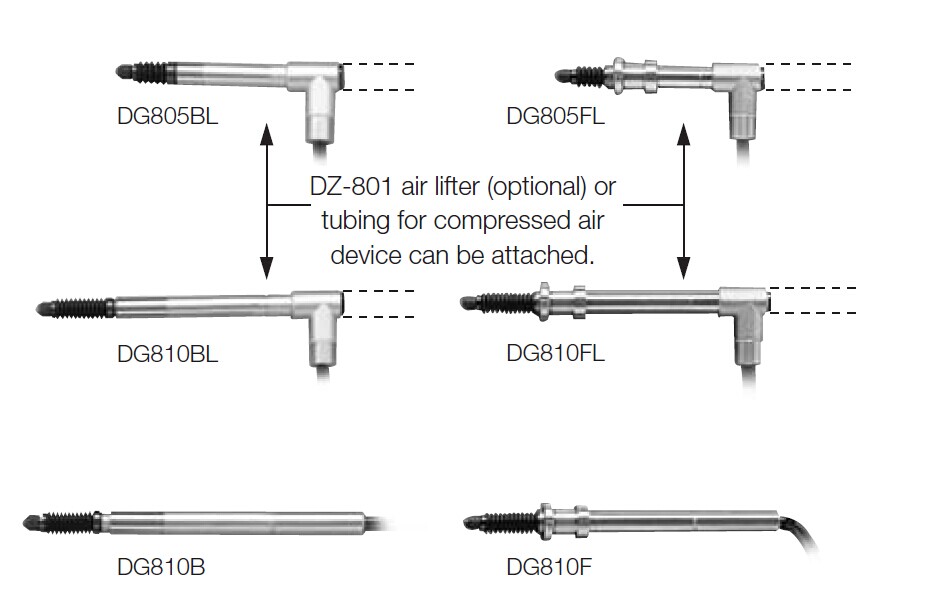 產品特性: 日本索尼Magnescale高精度探規DG810/805系列 產品特點: 1.磁力式; 2.適用于各種工廠作業環境,耐油、水、灰塵、震動、沖擊能力強; 3.解析度:0.5μm; 4.精度:2μm; 5.量測范圍:5.2mm,10mm; 6.小型細箱條狀:Φ8mm(外直徑),74.5mm(DG805); 7.低量測力; 8.使用氣壓元件可垂直移動轉軸(DG805BL/FL,DG810BL/FL); 9.防塵保護套(標準件); 10.安裝容易,亦可選購法蘭型探規。